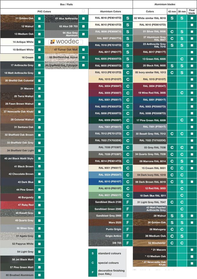 For choosing the colors, please check the PVC color chart. For the blades it can be checked the color chart of the Roller Shutter Blades.