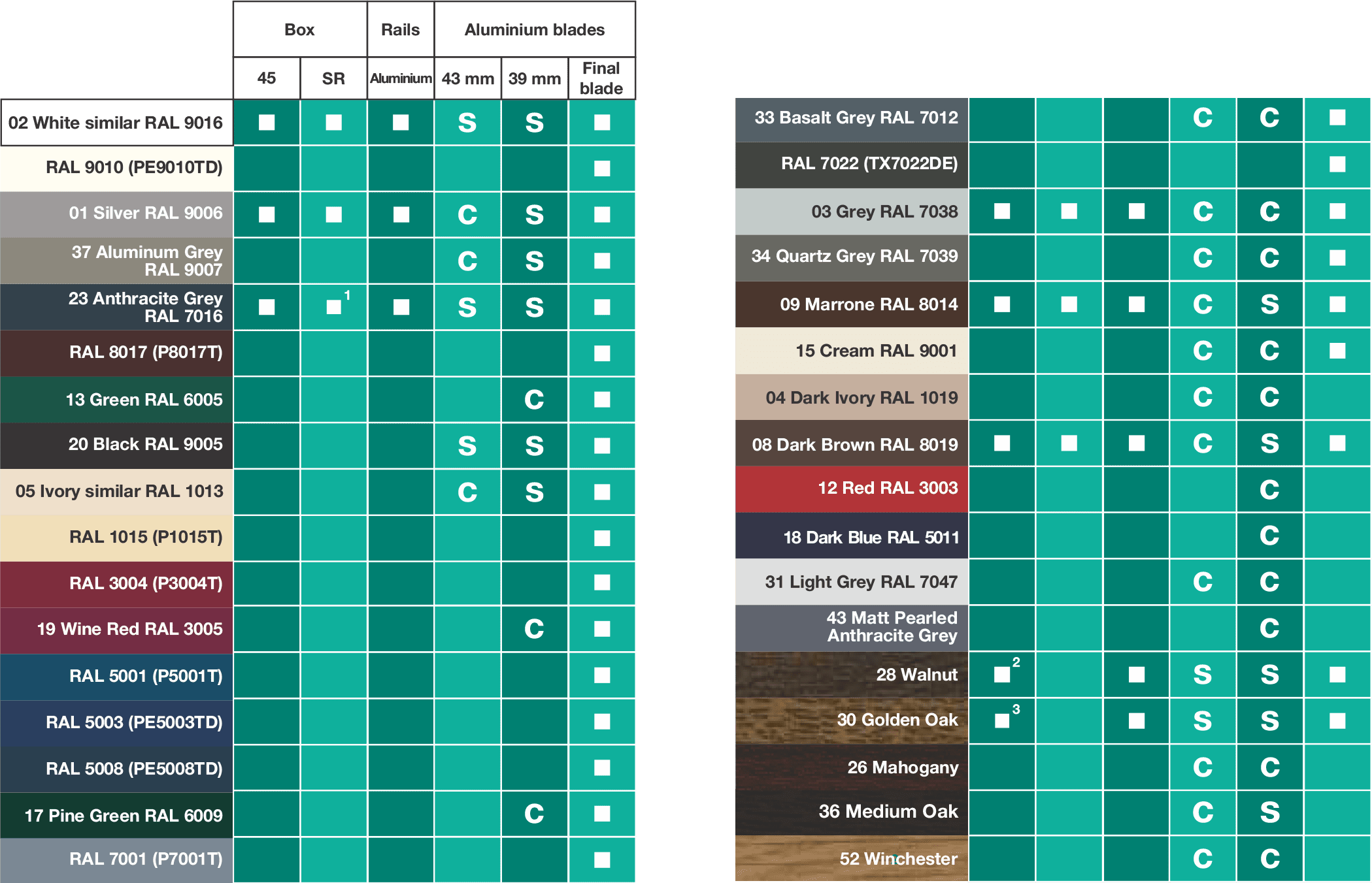 Available colors – boxes, rails